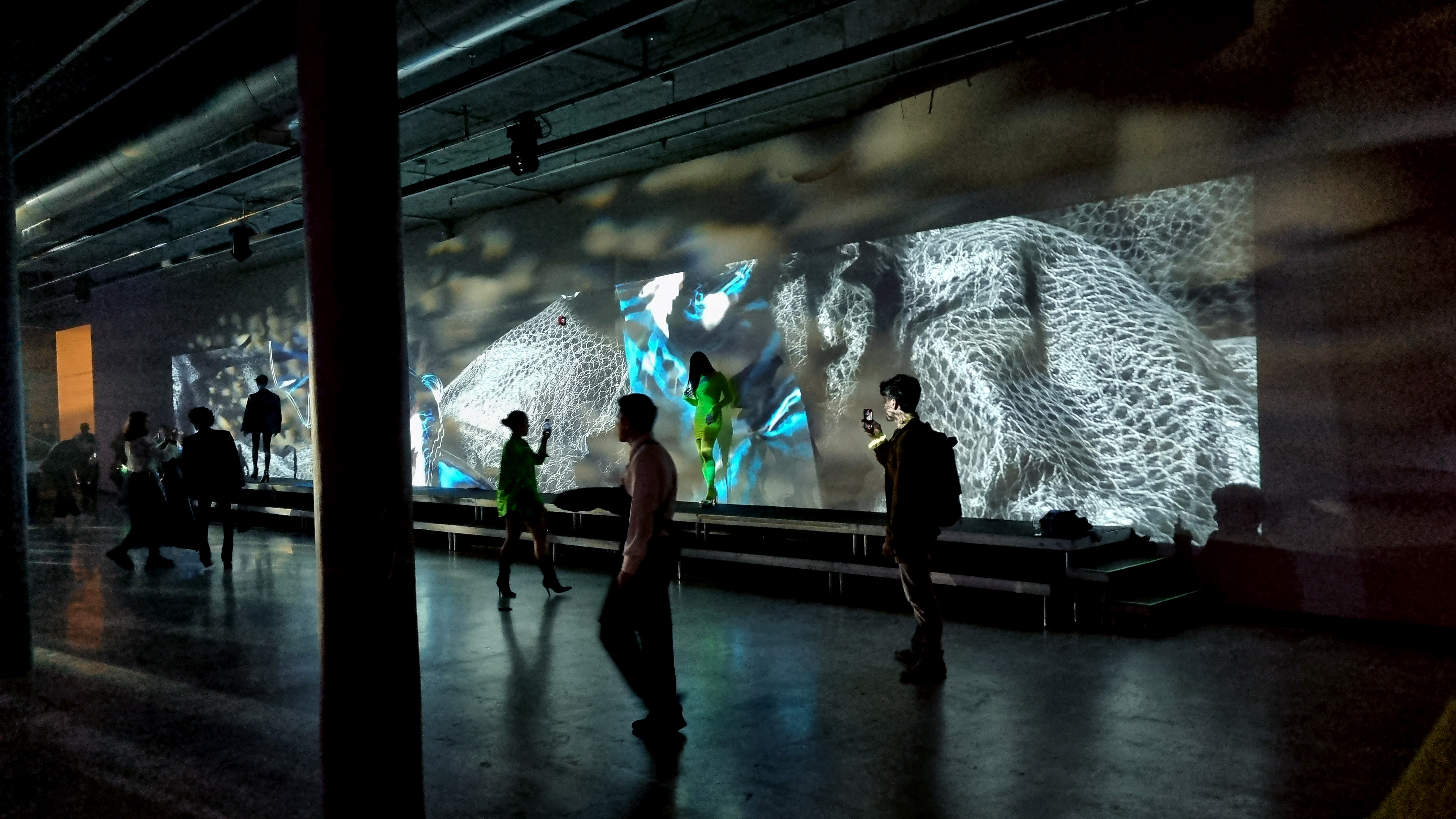 In May 2023 H&M commissioned me to create visuals for their H&M x Mugler launch event in Athens. I was asked to create two types of visuals. One short video that would be projected onto a 20x3 meters long wall. And another 6 looping square animations that would be playing simultanuesly on each side of a levitated LED cube. All the visuals are thought through the lens of the blue hour effect that was the main concept of the event, set by the H&M team. Also they are inspired by the elements of the collection itself and, particularly by its special materiality.